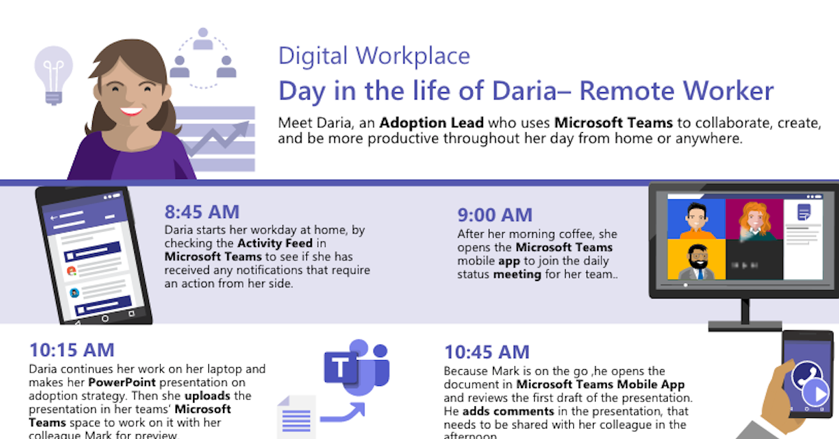 This infographic outlines a day in the life of a remote worker using Microsoft Teams to collaborate, create, and be more productive while working at home. See how this employee uses multiple features to stay connected with the team and work efficiently.