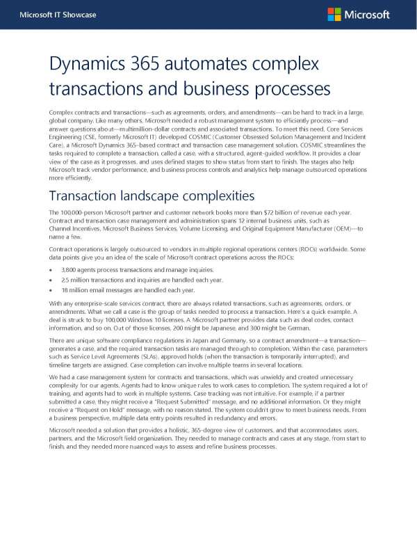 As your business grows, it can be difficult to find the right business application to help you transform. Microsoft needed a reliable and expedient way of helping employees manage their transaction growth. So, they used their own Dynamics 365 to create a solution. It lets them track and complete transactions more efficiently. You have access to the same tools.