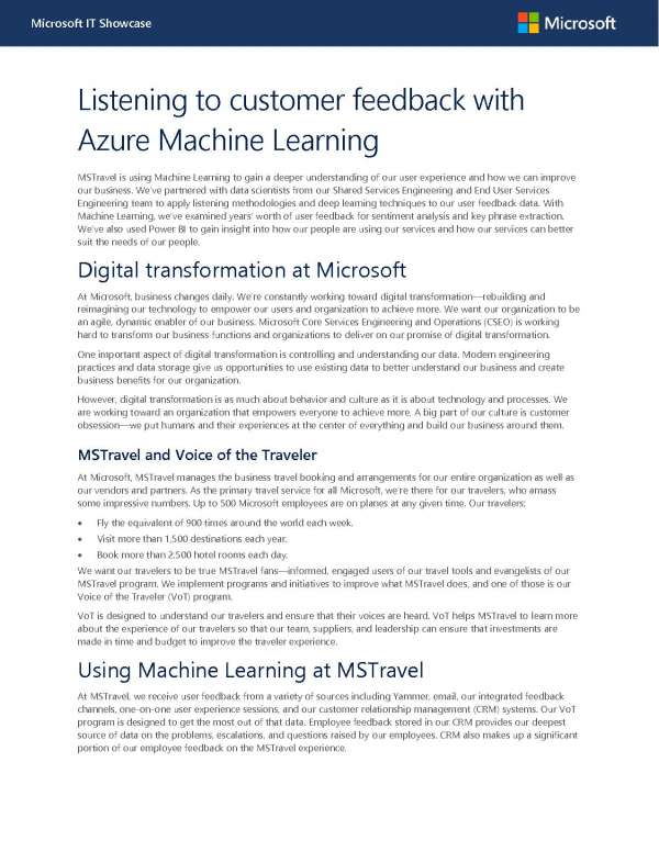 MSTravel uses Azure Machine Learning to extract data insights from traveler feedback and emails captured in Dynamics 365 CRM. These insights have helped them to build a more complete picture of users and their experiences.