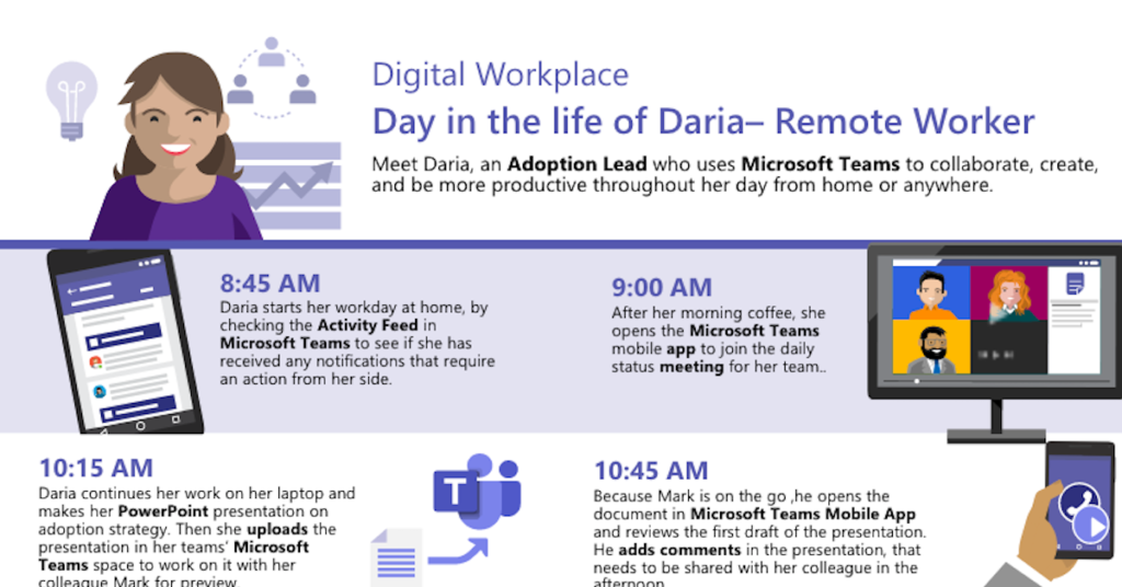 What does a day in your life look like when you work remotely? As more workers are staying home to stay safe, the working day is changing. But you can help your team stay connected, stay on schedule, and keep up their great work with Microsoft Teams. This infographic will help you understand how