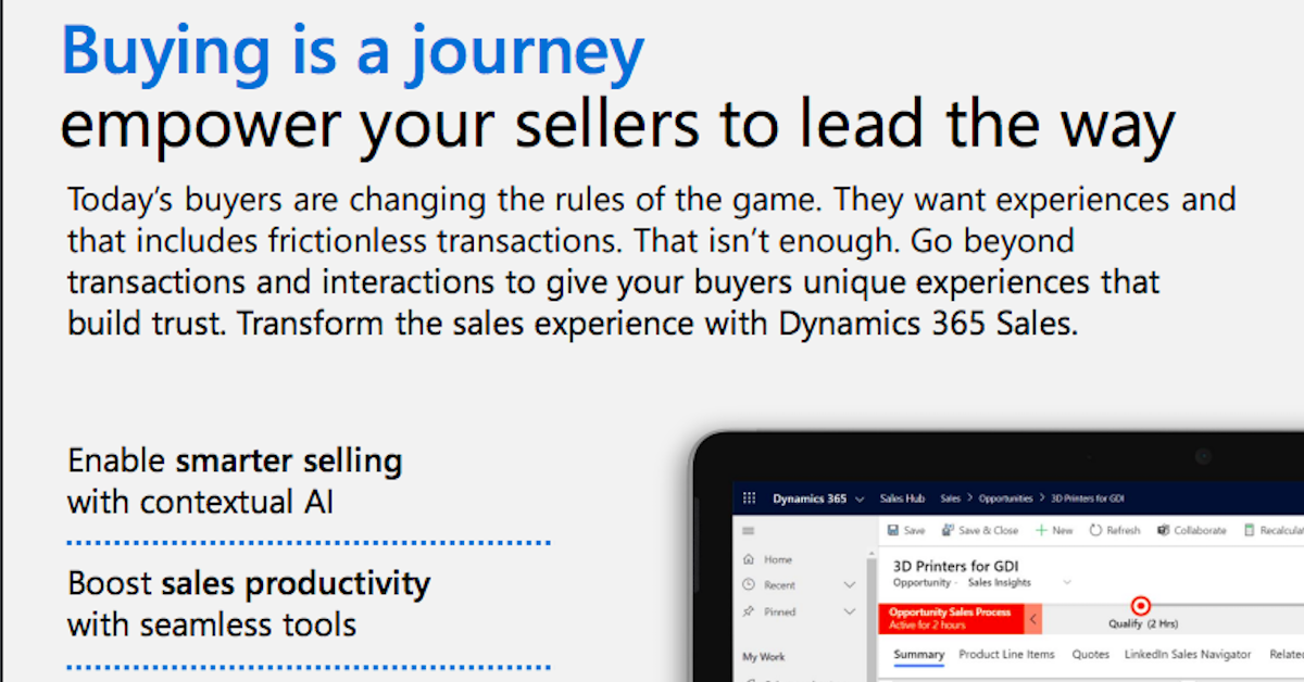 Go beyond transactions and interactions to give your buyers unique experiences that build trust. Transform the sales experience with Dynamics 365 Sales. Features include enabling smarter selling with contextual AI, increasing sales profitably with advanced insights, and improving coaching and sales performance.