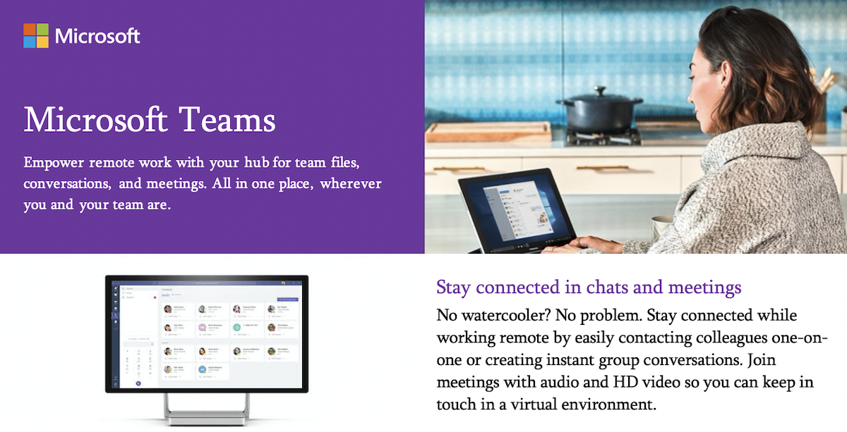 This flyer highlights some of the key features in Microsoft Teams that allow customers to stay connected, collaborate, and increase productivity—all in one place. The flyer also offers ideas on how customers can use Teams to make remote work more efficient and even fun.