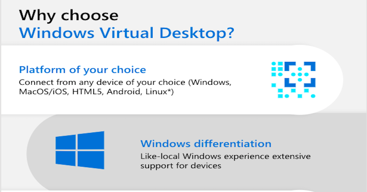 This infographic identifies the top six reasons to choose WVD: platform of your choice, Windows differentiation, enhanced protocol, containerized User Profiles, native Office 365 performance, and Teams enhancements.